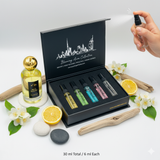 The Blooming Aura Collection celebrates freshness and romance. With 5 testers (each 6 ml, totaling 30 ml), this unisex set highlights floral, citrus, and woody blends, ideal for day-to-night wear.