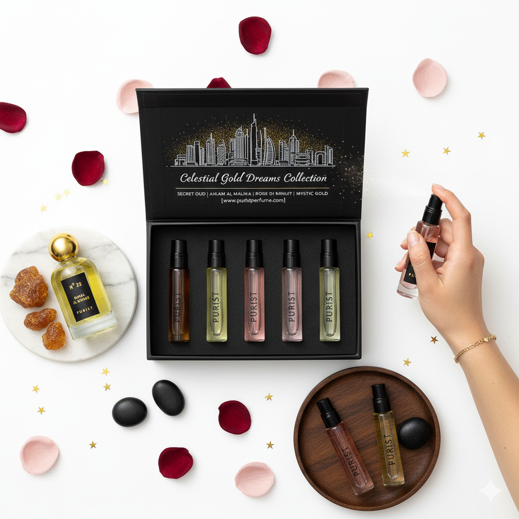 Enter a world of divine femininity with the Celestial Gold Dreams Collection. This tester set (6 ml × 5, total 30 ml) blends roses, oud, and golden warmth, designed for women who radiate confidence and grace.